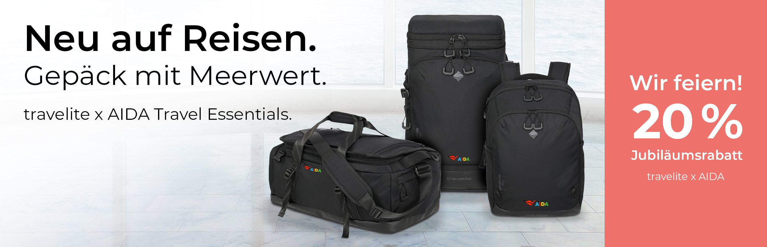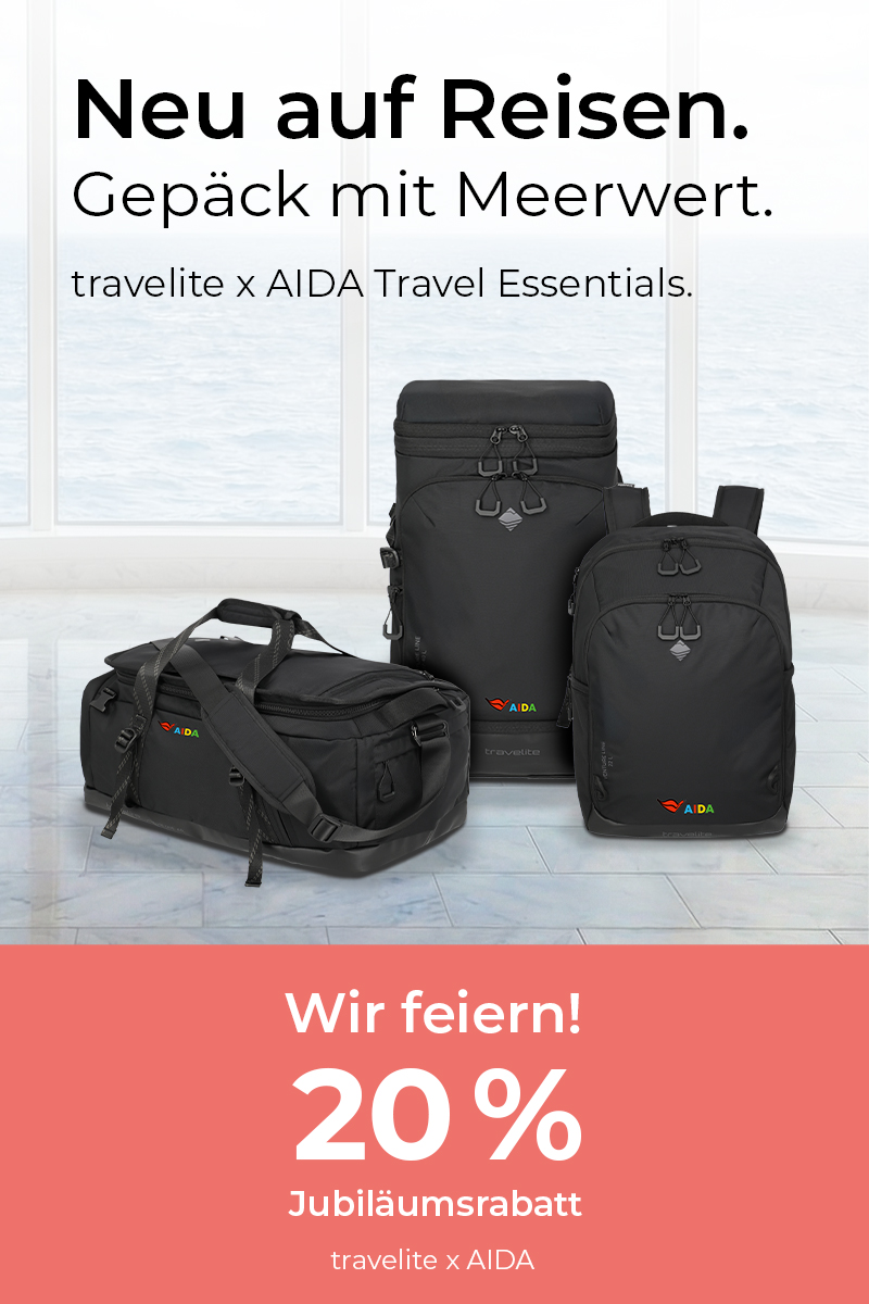 Zwei starke Partner, eine gemeinsame Leidenschaft: das Reisen. Seit einem Jahr verbindet travelite x AIDA Kreuzfahrtleidenschaft mit durchdachtem Gepäck für unterwegs. Die Kollektion steht für entspannte Reisemomente – ob mit Koffer, Rucksack oder Reisetasche – und begleitet jede Reisephase mit Funktion und maritimem Flair. Zum Jubiläum feiern wir unsere gemeinsame Reise mit 20 % Rabatt auf das gesamte travelite x AIDA Sortiment – vom 02.03. bis 15.03.