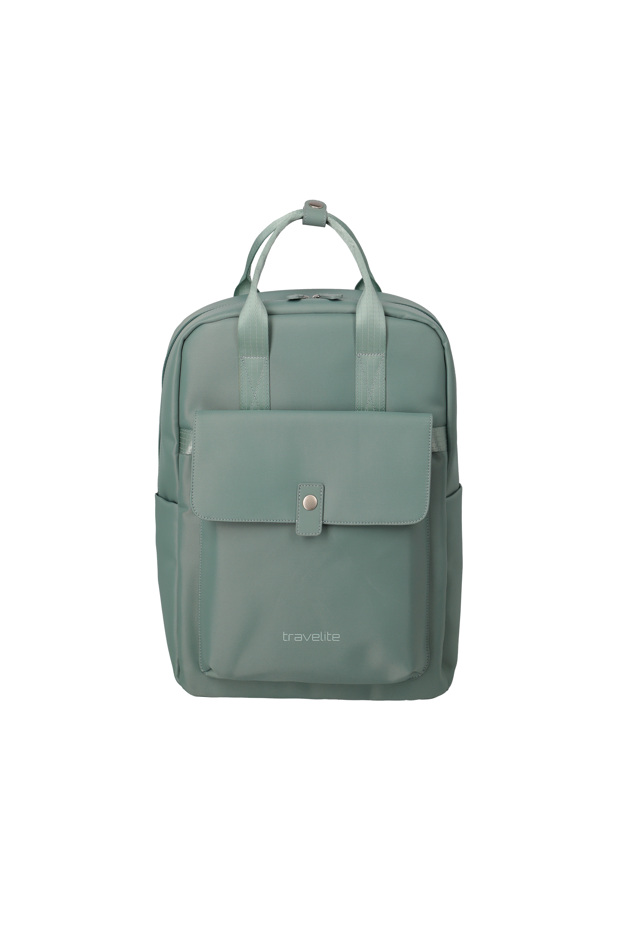 A mint green rucksack with top handles and shoulder straps is set against a white background. A rectangular front pocket with a flap and a press stud is attached in the centre. The brand name "travelite" is printed in the centre.