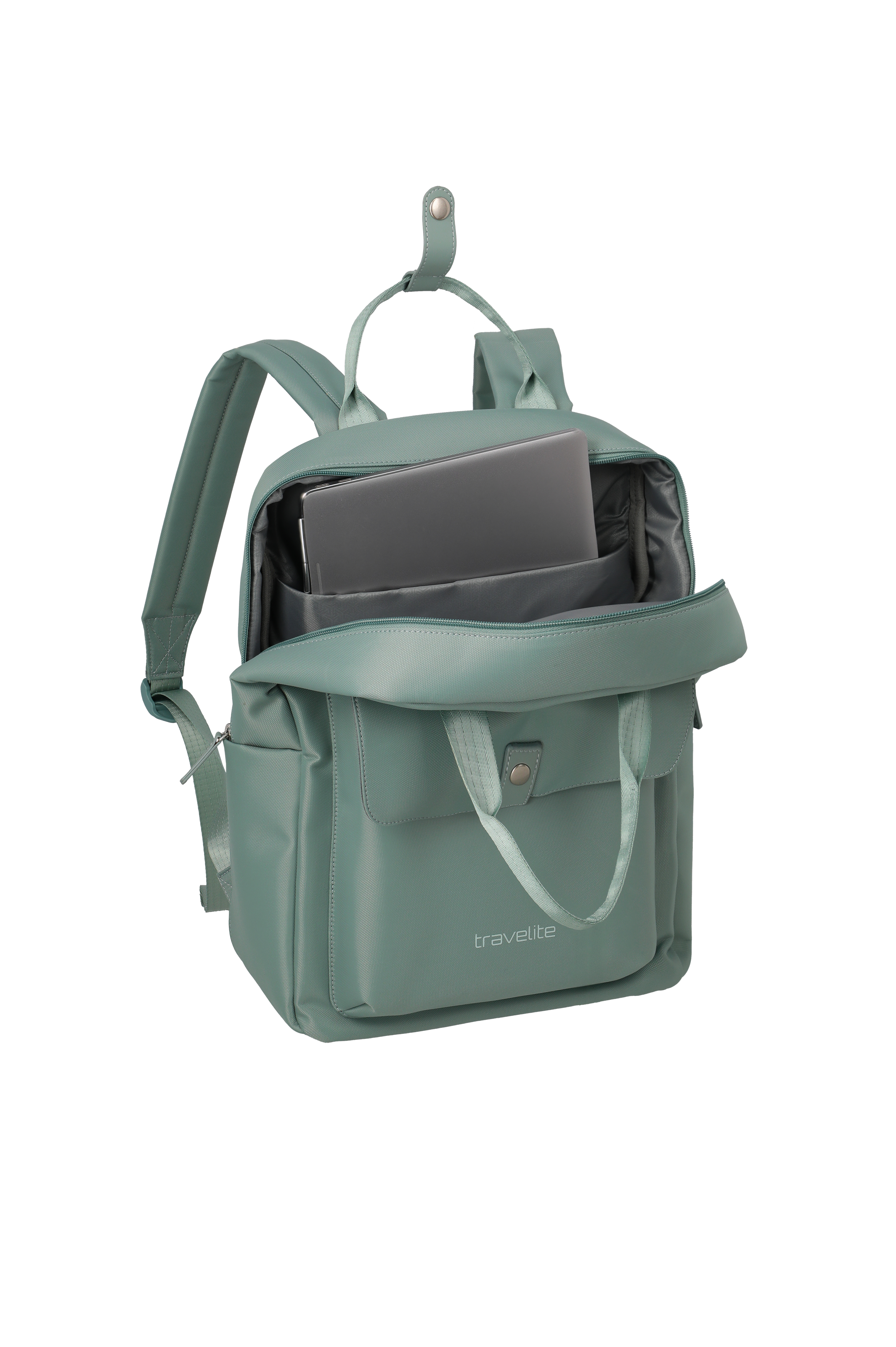 An open, light turquoise-coloured backpack with carrying handles and shoulder straps stands in front of a white background. A grey laptop is in the backpack. At the front is a pocket with a button and the lettering "travelite".