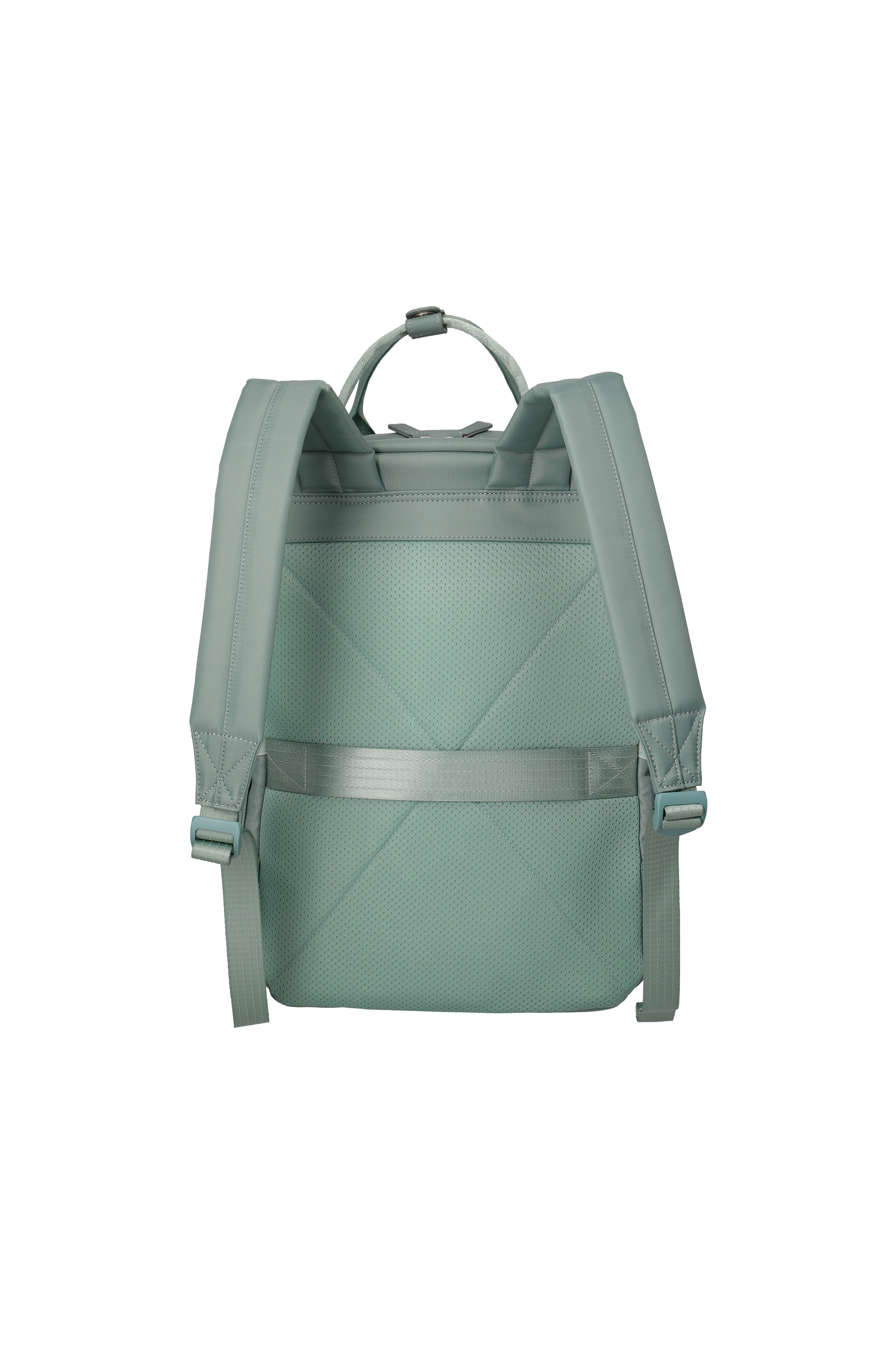 Back of a light green rucksack with two padded shoulder straps and top handle. Back section made of breathable mesh material. A horizontal strap runs down the centre of the back section. Adjustable straps.